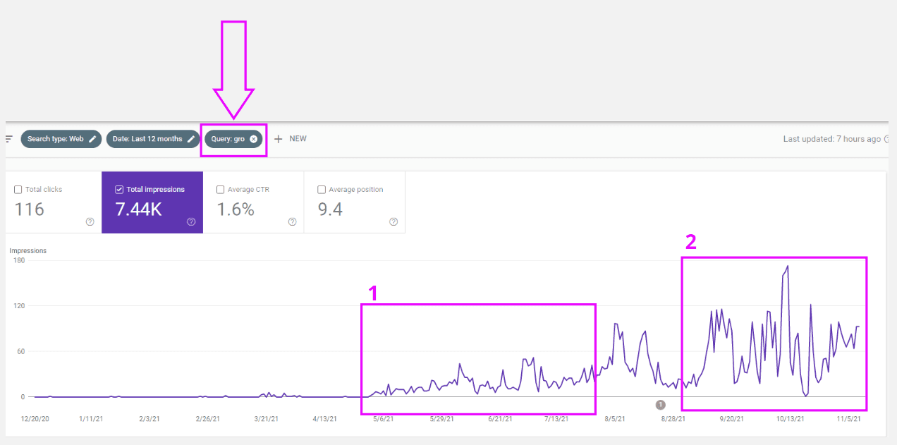 La flèche montre toutes les « Query » où des internautes ont aperçu mon site dans leur recherche sur Google avec le mot Gro pour les 12 derniers mois. Pendant 6 mois, pratiquement personne ne cherchait mon brand sur Google. Important de noter que le CTR, donc le nombre de clics est relativement faible.