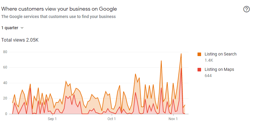 Le carré avec le chiffre « 1 » au-dessus du carré mauve de gauche montre une augmentation des apparitions du site Gro suite au début de certaines actions marketing, principalement organiques et un webinaire au mois de juin. Ensuite, dans le deuxième carré, on peut voir une nette augmentation qui a lieu en même temps que la mise en ligne de plusieurs campagnes de notoriété sur les médias sociaux et d’une augmentation au niveau du budget publicitaire (1000$/mois total). On peut aussi observer une augmentation au niveau des recherches sur Google My Business: