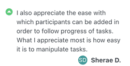 I appreciate the simplicity of adding participants for each task so they can track the progress of each task.