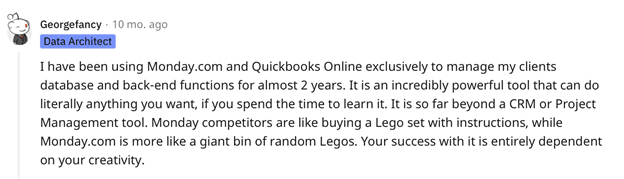 I have been using Monday and Quickbooks only for managing my clients and my background information for two years. It is a very powerful tool that can do everything if you take the time to study it. It is truly above all kinds of project management tools.