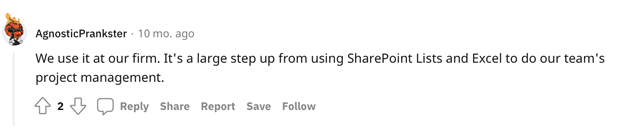 We use it in our company. It’s a significant improvement compared to SharePoint Lists and Excel for project management.