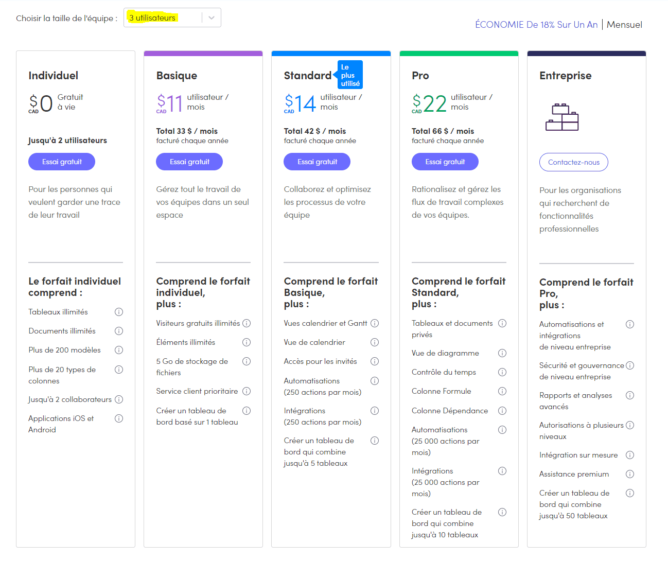 The Standard plan represents an excellent compromise for small to medium-sized teams. It allows inviting external parties, accessing Gantt and calendar views, and integrating up to 250 automations and integrations per month. It is ideal if your projects are not excessively complex but require a minimum of collaboration and structuring.